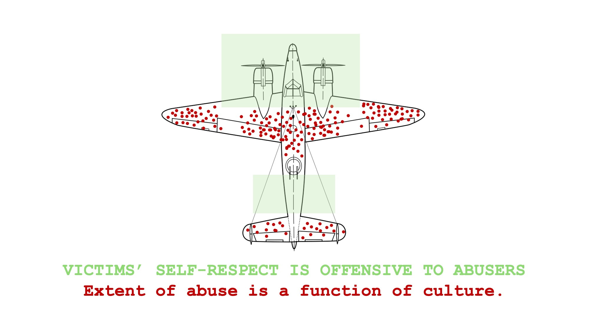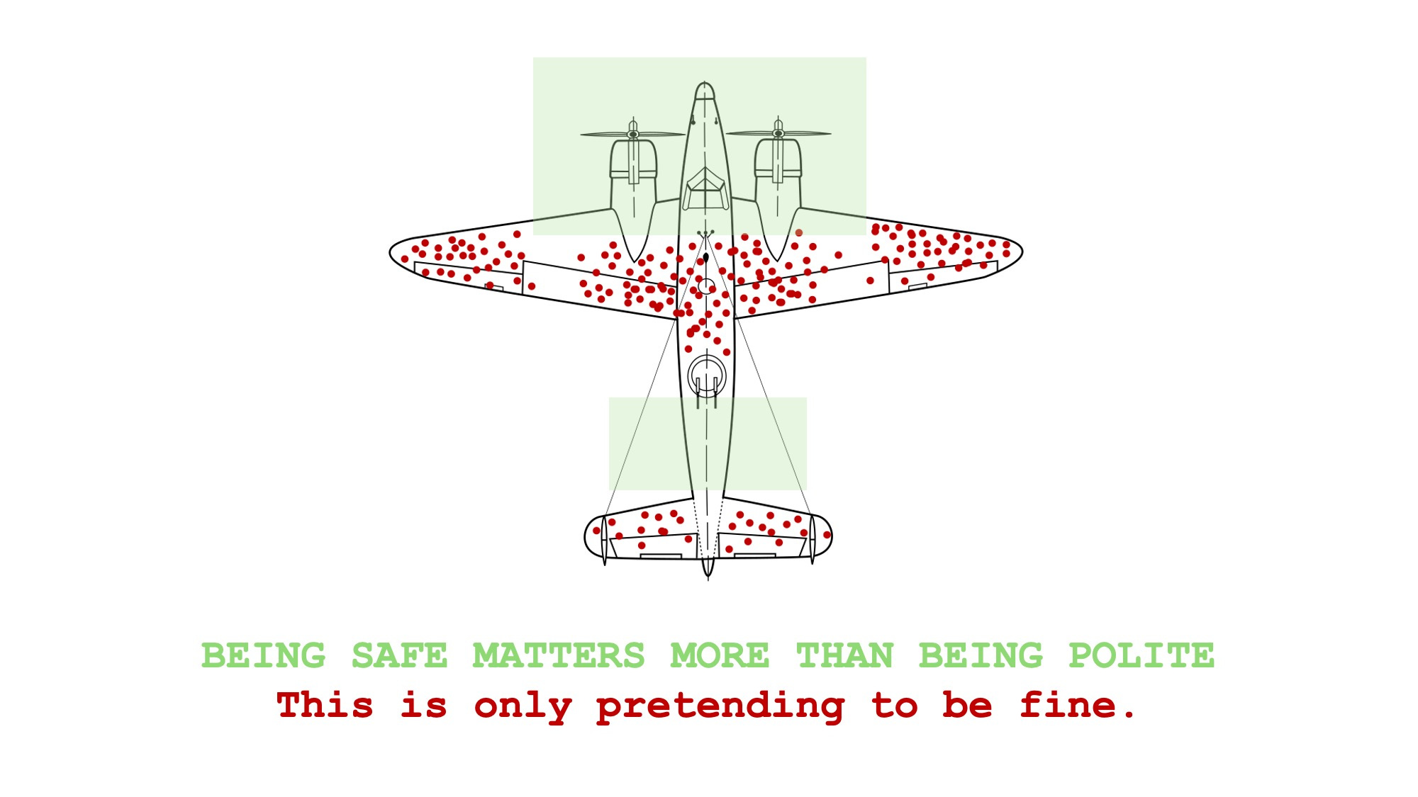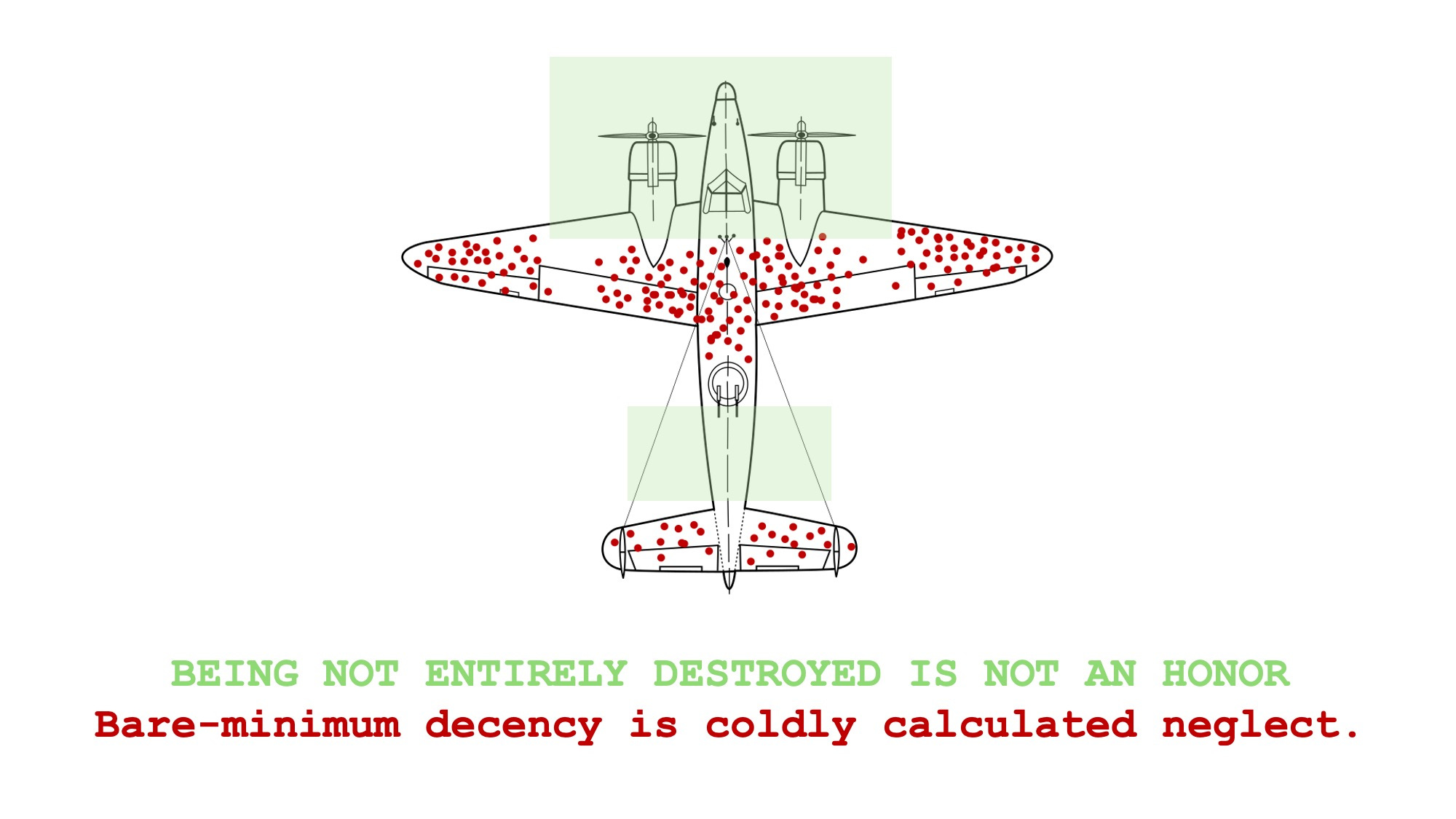 It shows that the fragile places are the only ones that matter. It shows that being safe is a function of protecting what keeps you flying. The red dots are non-deadly hits. The green areas are the places that if hit, end the mission.